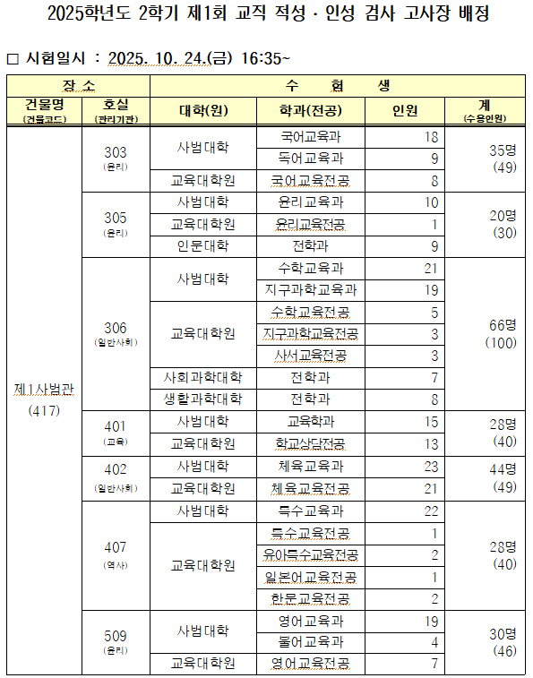2. 2025년 10월 24일(금) 16시 35분 까지 지정된 고사장으로 입실하여야 하며, 20분간 시험 감독관의 주의사항 전달, 시험지 및 답안지 배부 등 준비과정을 거칠 예정입니다. 실제 검사 시간은 16:55~17:30(35분간) 입니다.