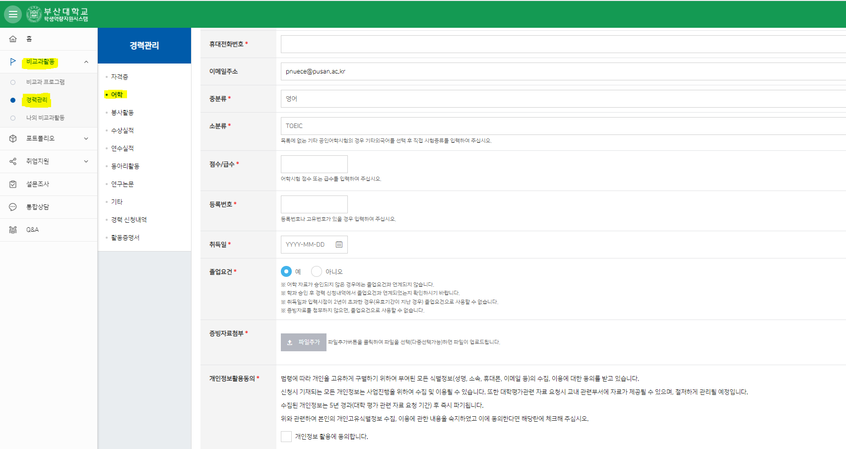 가. 학생역량지원시스템 → 비교과활동 → 경력관리 → 어학에서 공인인증영어성적을 제출